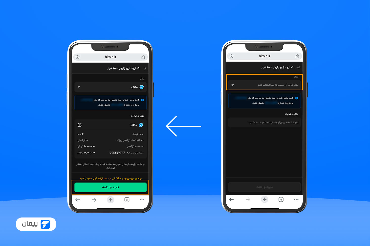 برای فعال‌سازی قرارداد واریز مستقیم باید شماره موبایل و کد ملی واردشده با اطلاعات حساب بانکی مطابقت داشته باشد؛ اطمینان حاصل کنید که شماره موبایل واردشده با شماره موبایل احرازشده در بانک و بیت‌پین یکسان باشد.
