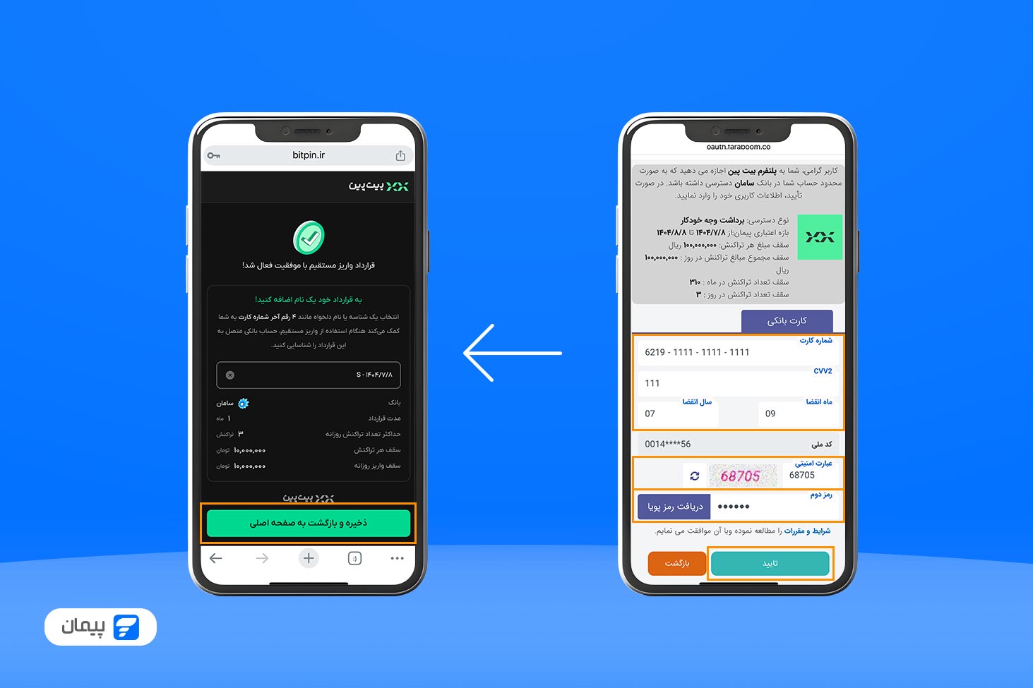 پس از تایید تنظیمات قرارداد، لازم است که اطلاعات بانکی و هویتی شما احراز شود. برای این احراز، به درگاه OAuth پیمان، منتقل می‌شوید و پس از انجام عملیات، دوباره به بیت‌پین برمی‌گردید.
