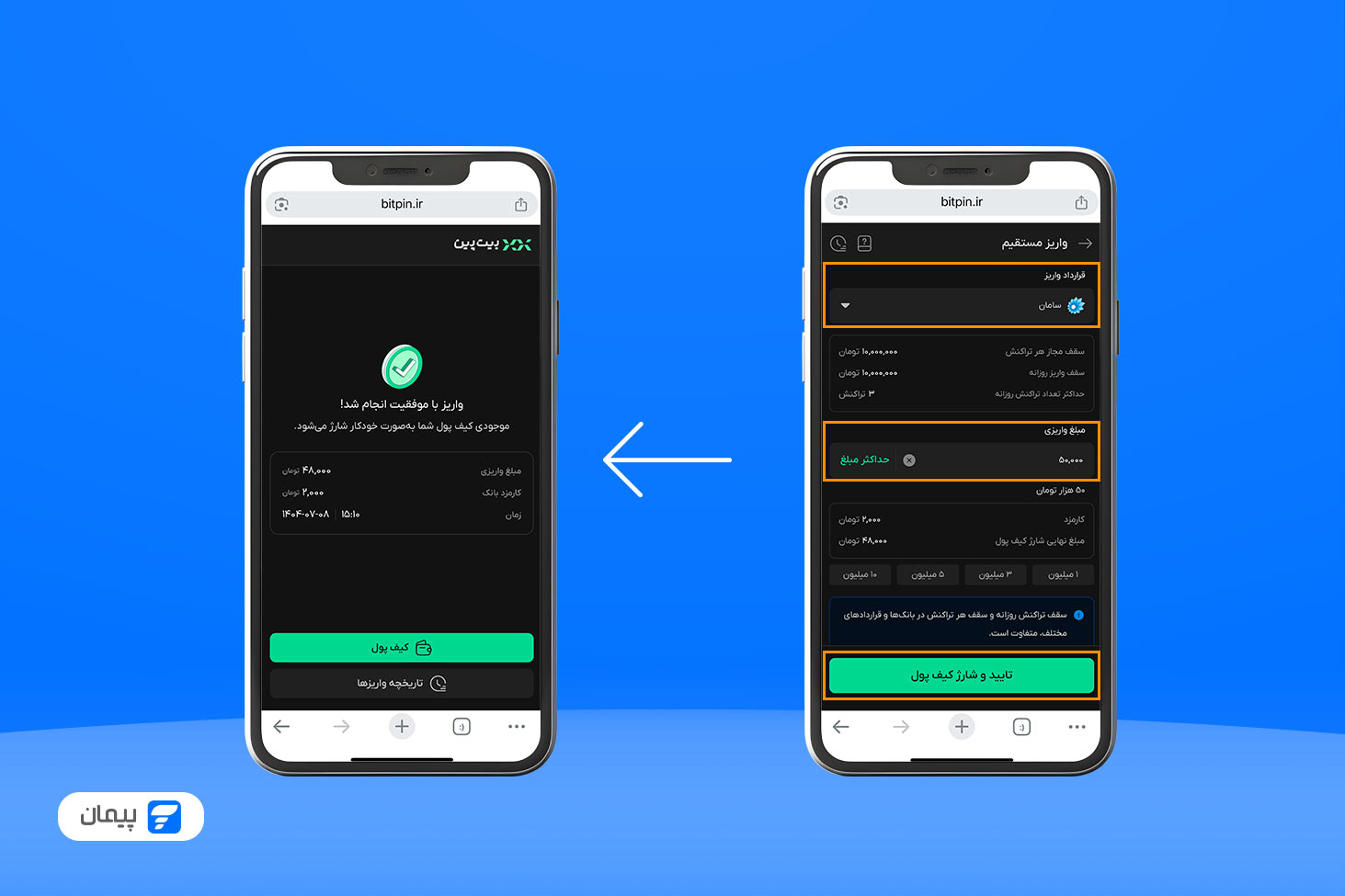 راهکار پرداخت آنی پیمان (Instant Payment) در بیت‌پین پیاده‌سازی شده و «واریز مستقیم» نام دارد. با فعال‌سازی این روش، می‌توانید کیف پول ریالی خود را به‌طور مستقیم از طریق حساب بانکی‌تان شارژ کنید؛ بدون نیاز به ورود اطلاعات کارت بانکی در هر بار پرداخت.